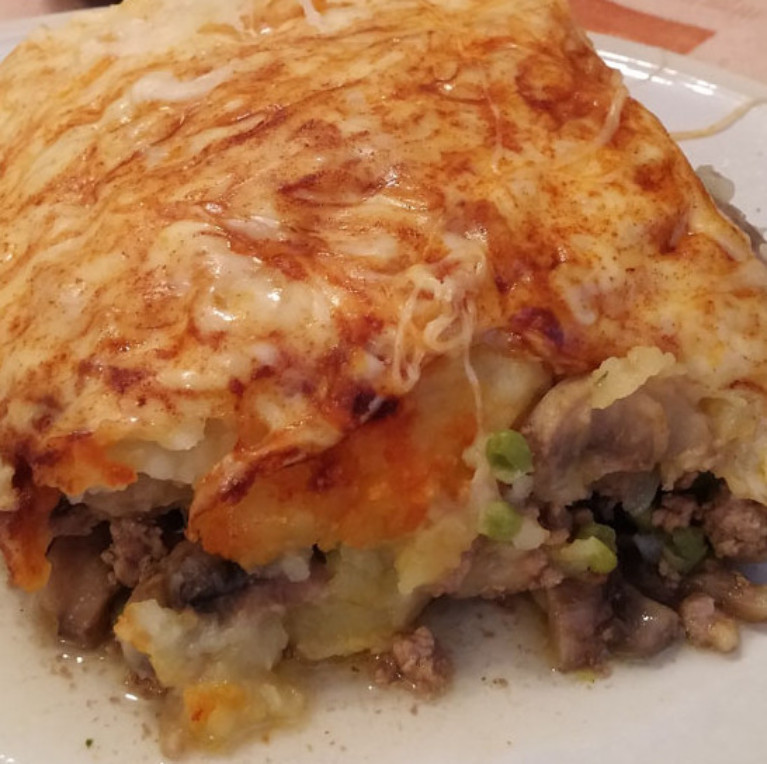 - FINALLY GREASE YOUR BAKING DISH, THEN ADD YOUR MEAT & VEGGIE MIXTURE FOLLOWED BY YOUR MASHED POTATOES ON TOP (SPREADING EVENLY WITH SPATULA)