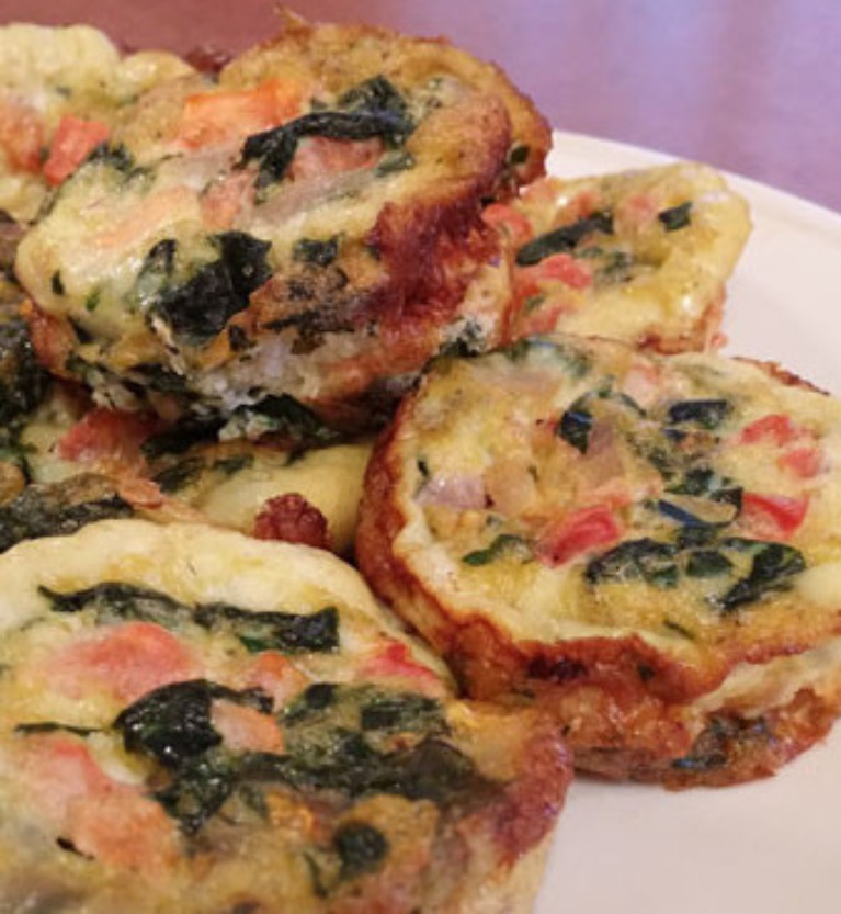 GREASE MUFFIN TINS WELL AND PLACE THE SAUTEED VEGGIES AT THE BOTTOM